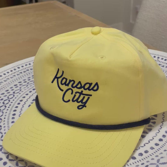A fresh take on a classic. This Kansas City rope hat features a soft butter-yellow crown with navy embroidered script and a vintage-inspired rope detail across the brim. Easy, lightweight, and effortlessly cool — this is the kind of hat you’ll grab for coffee runs, ballgames, and everything in between.